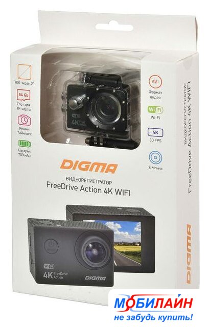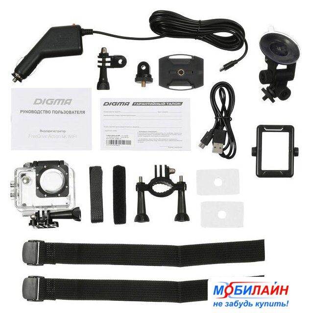 Комплект поставки | - Видеорегистратор FreeDrive Action 4K WIFI- Крепление на лобовое стекло автомобиля- Водонепроницаемый бокс- Крепление на руль велосипеда- Основное крепление- Крепление для шлема- Адаптер-кронштейн 1- Адаптер-кронштейн 2- Повязка-бандаж- Дополнительный скотч 3М- Автомобильный адаптер питания- Батарея- Рамка- USB-кабель- Руководство пользователя- Гарантийный талон |