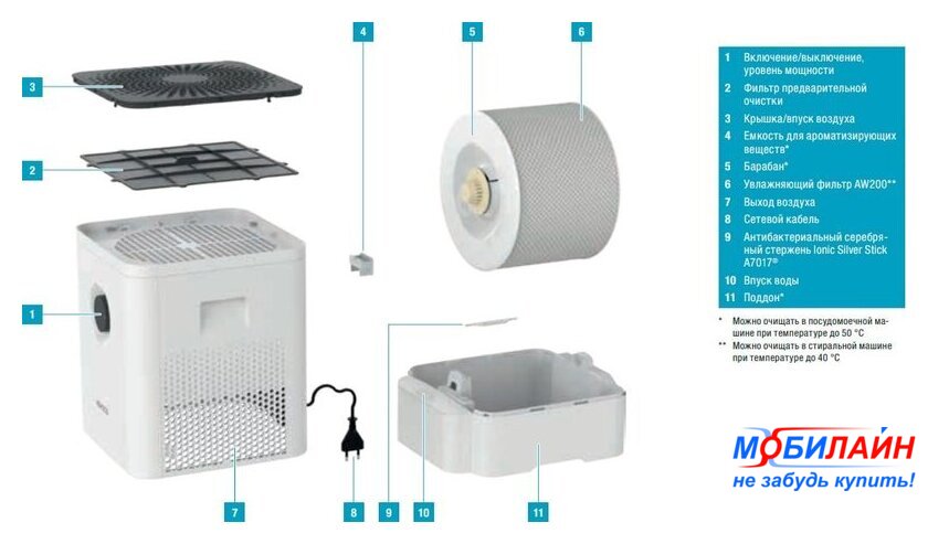 мойка воздуха, расход воды до 350 мл/ч, для помещения до 50 м², шум 27 дБ, питание: сеть, цвет белый