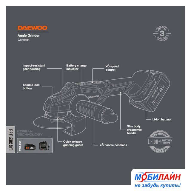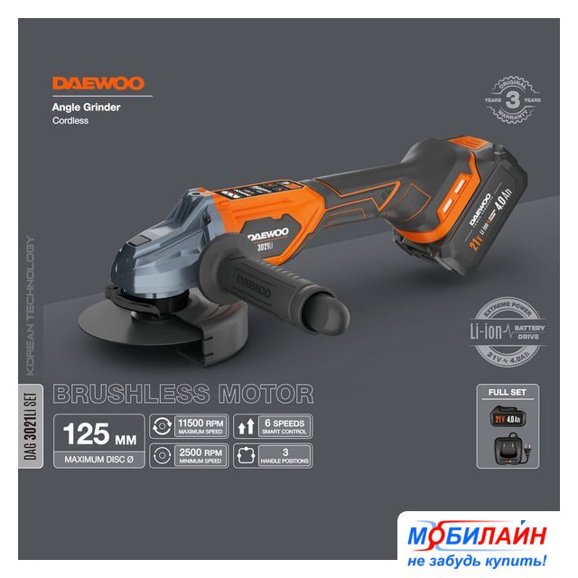 Комплект поставки | - Углошлифовальная машина - 1 шт.- Аккумулятор 4.0 Ач - 1 шт.- Зарядное устройство - 1 шт.- Фланец - 1 шт.- Ключ - 1 шт.- Дополнительная рукоятка - 1 шт.- Защитный кожух - 1 шт.- Руководство по эксплуатации - 1 шт.- Кейс |