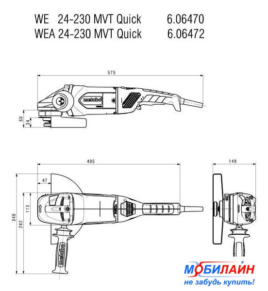 диаметр диска: 230 мм, 2400 Вт, 6600 об/мин холостого хода, питание: сеть, 5.6 кг