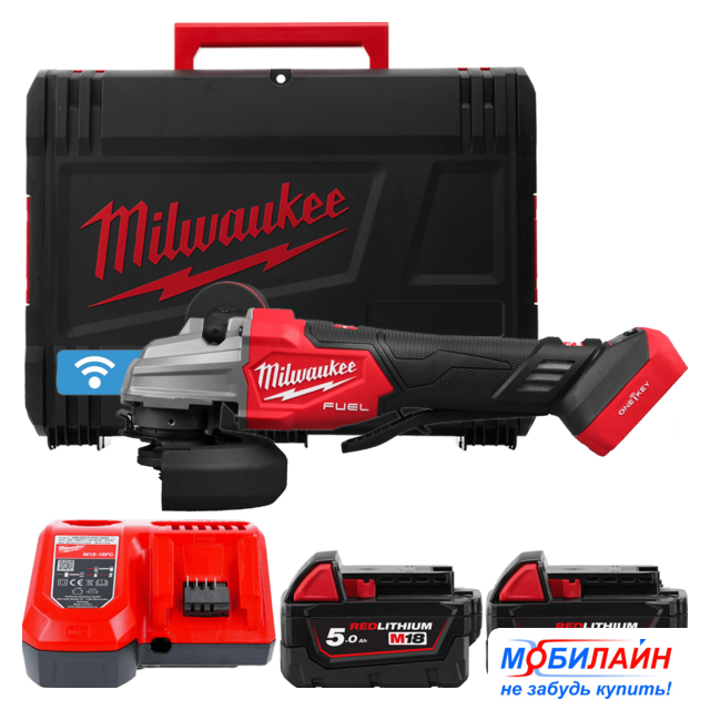 Комплект поставки | - защитный кожух, - неснимаемая рукоятка, - фланец,- фланцевая гайка, - ключ, - противопылевой экран, - 2 аккумуляторных блока M18 B5, - зарядное устройство M12-18 FC- кейс |