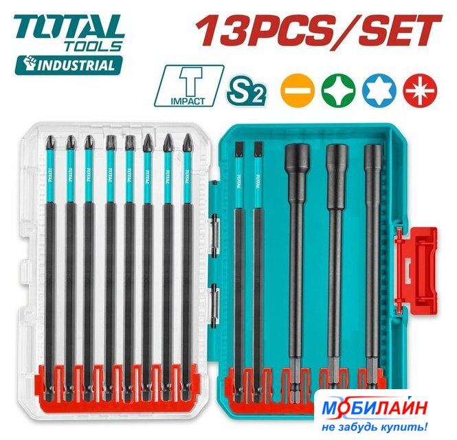Комплектация | - Ударные биты 150 мм (PH1/PH2/PH3, PZ1/PZ2/PZ3, SL4/SL5, T25/T30) - 10 шт.- Ударные торцевые насадки 150 мм (6 / 8 / 10 мм) - 3 шт.- Кейс- Блистер |