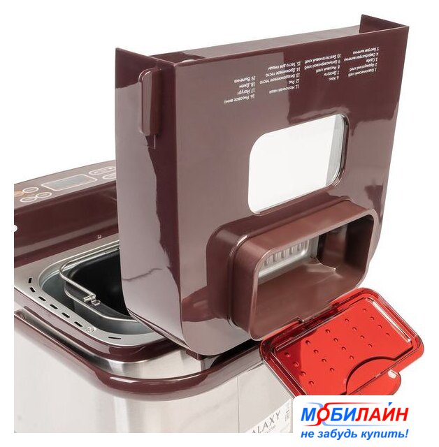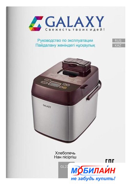 Комплект поставки | - хлебопечь;- контейнер для выпечки;- лопасть для замешивания;- мерный стаканчик;- ложка-дозатор;- крючок для извлечения лопасти для замешивания;- книга рецептов;- руководство по эксплуатации;- потребительская тара. |