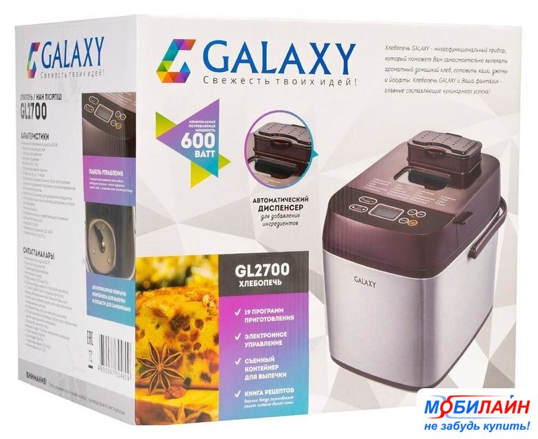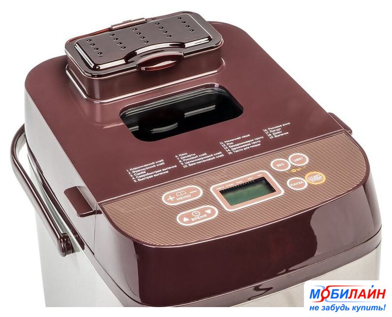 650 Вт, вес выпечки: 750 г, регулировка веса выпечки, 19 программ выпечки, выбор цвета корочки, замес теста