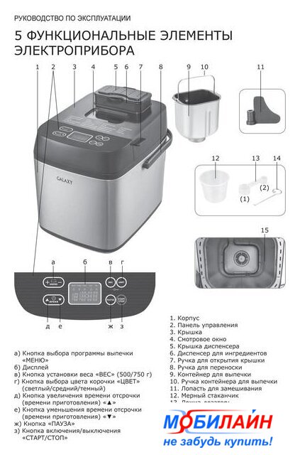 550 Вт, вес выпечки: 900 г, регулировка веса выпечки, 15 программ выпечки, выбор цвета корочки, замес теста