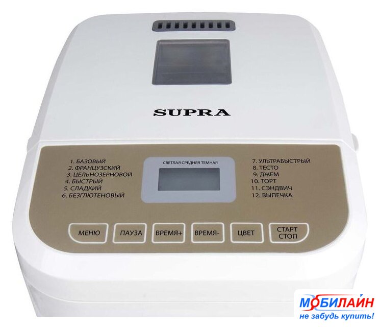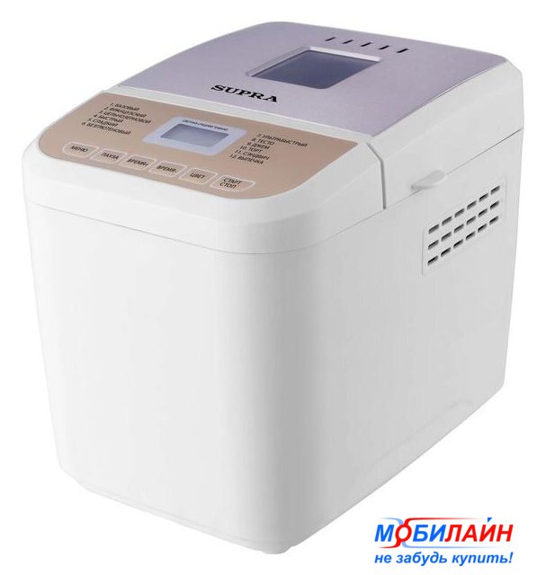 Перечень режимов работы | 1. Базовый2. Французский3. Цельнозерновой4. Быстрый5. Сладкий6. Безглютеновый7. Ультрабыстрый8. Тесто9. Джем10. Торт11. Сэндвич12. Выпечка |