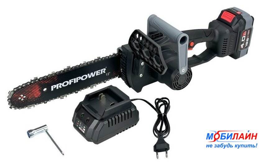 Комплект поставки | - Пила;- Шина;- Цепь пильная;- Зарядное устройство;- Аккумулятор 4.0 Ач;- Ключ;- Коробка;- Инструкция с гарантийным талоном. |