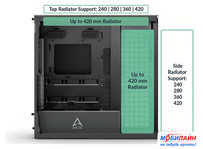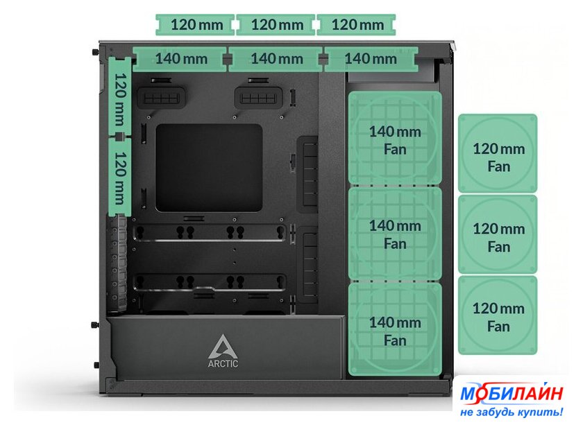 Расположение вентиляторов | сверху:3x120 мм или 3x140 ммсбоку:3x120 мм или 3x140 ммсзади:2x120 ммустановленысбоку:3x140 ммсзади:2x120 мм |