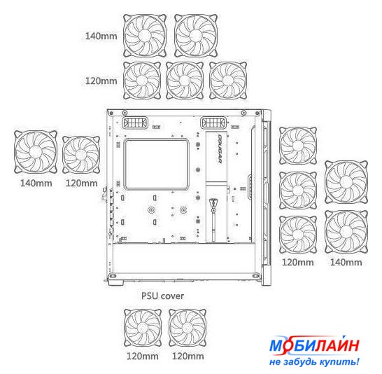 | Конфигурация вентиляторов | спереди: 120mm x 3 / 140mm x 2сверху: 120mm x 3 / 140mm x 2снизу на кожухе БП: 120mm x 2сзади: 120mm x 1 / 140mm x 1в комплекте:спереди: 120mm ARGB fan x 3сзади: 120mm ARGB fan x 1 |