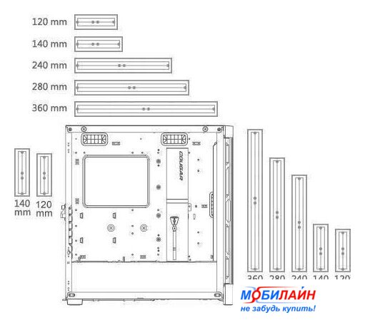 | Расположение СЖО | спереди: 360mm / 280mm / 240 mm / 140 mm / 120mmсверху: 360mm / 280mm / 240 mm / 140 mm / 120mmсзади: 140 mm / 120mm |