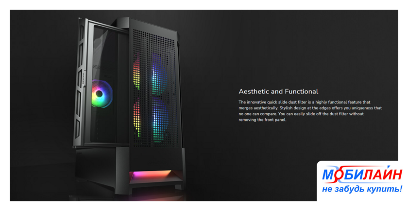 Mini Tower, БП отсутствует, для плат micro-ATX/mini-ITX, с 4 вентиляторами в комплекте, окно: закаленное стекло, видеокарта до 320 мм, охлаждение ЦП до 165 мм, пылевые фильтры, 1xUSB 2.0, 2xUSB-A 3.2 5Гбит/с, цвет черный