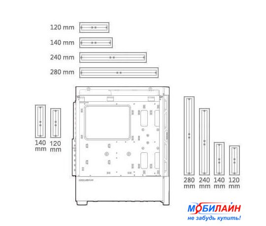 Поддерживаемые СЖО | спереди: 280mm / 240mm / 140mm / 120mmсверху: 280mm / 240mm / 140mm / 120mmсзади: 140mm / 120mm |