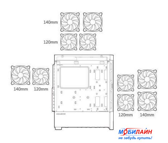 Конфигурация вентиляторов | спереди: 140mm x 2 / 120mm x 2сверху: 140mm x 2 / 120mm x 2сзади: 140mm x 1 / 120mm x |