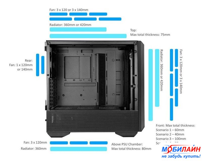 | Расположение СЖО | Спереди: 360 мм или 420 ммВерх: 360 мм или 420 ммНад камерой блока питания: 360 мм |