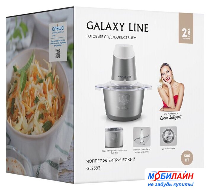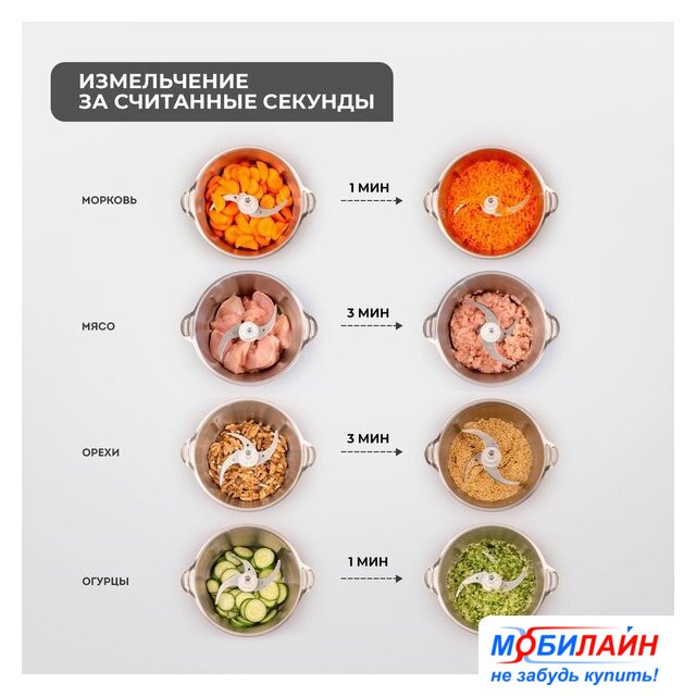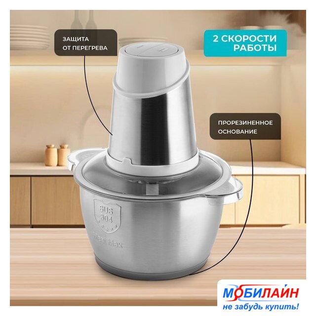 чоппер, питание от сети, 300 Вт, регулировка скорости, чаша 2 л, материал чаши: стекло, материал корпуса: пластик, белый