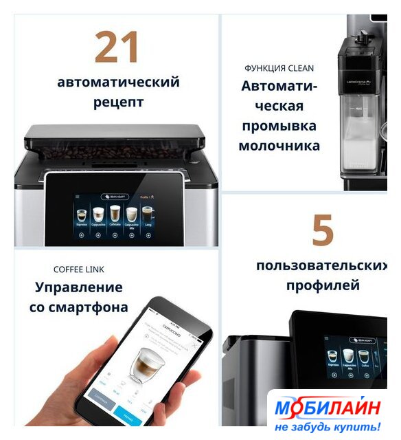 Программы приготовления | эспрессо, лунго, американо, капучино, латте макиато, флэт уайт, латте, доппио, кортадо, лонг блэк, горячее молоко, кофе в кофейник, холодный кофе |