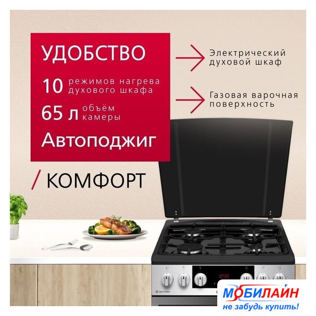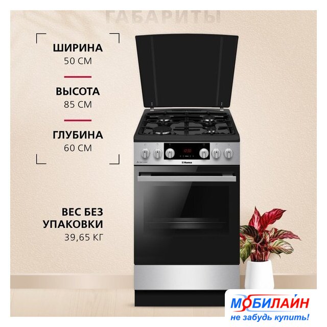 газовая панель + газовый духовой шкаф, газ-контроль конфорок, поверхность: нержавеющая сталь, крышка из закалённого стекла, управление механическое, таймер электронный, размеры (ШхГхВ): 50x58.5x85 см, цвет нержавеющая сталь