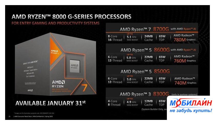 2024 г, Phoenix, AM5, 6 ядер, 12 потоков, частота 5/4.3 ГГц, кэш 6 МБ + 16 МБ, техпроцесс 4 нм, TDP 65W