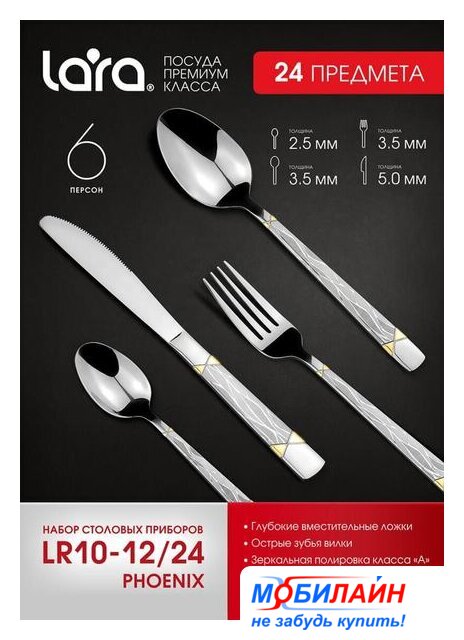 набор столовых приборов, 24 прибора на 6 персон: вилка столовая/ложка столовая/ложка чайная/нож столовый, рабочая часть: нержавеющая сталь, ручка: нержавеющая сталь, пригодность для посудомойки, коробка для хранения в комплекте