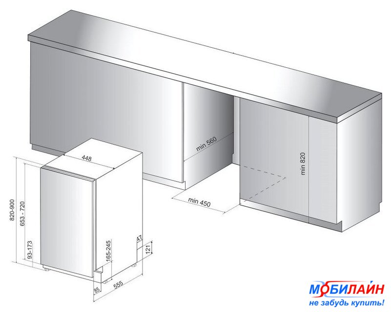 загрузка на 10 комплектов посуды, сенсорное управление, 7 программ, 44.6x55x82 см, черный цвет, сушка: с открыванием дверцы, индикация на полу: проекция дисплея