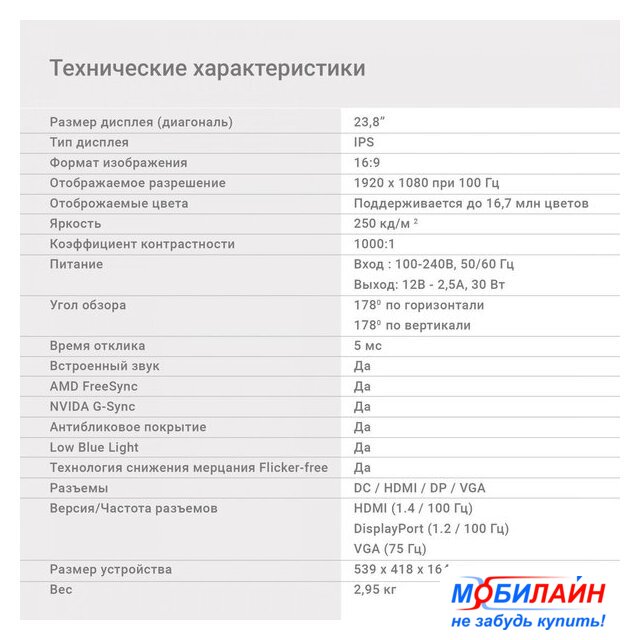 23.8", 16:9, 1920x1080, IPS, 100 Гц, динамики, интерфейсы HDMI+DisplayPort+D-Sub (VGA)