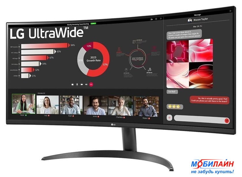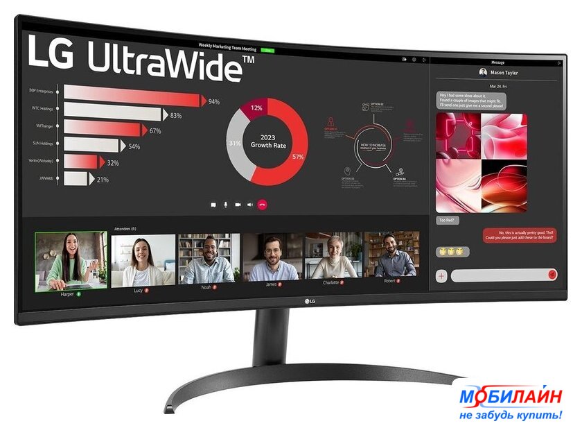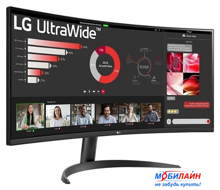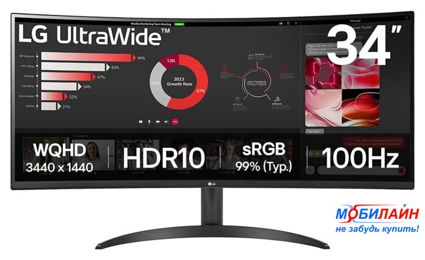 34", 21:9, 3440x1440, VA, подсветка боковая (Edge LED), изогнутый (1000R), 180 Гц, AMD FreeSync Premium, динамики, интерфейсы HDMI+DisplayPort