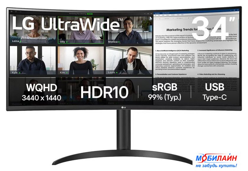 34", 21:9, 3440x1440, VA, изогнутый (1800R), 100 Гц, интерфейсы HDMI+DisplayPort