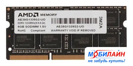 8 ГБ, 1 модуль DDR3 SO-DIMM, частота 1600 МГц, CL 11T, тайминги 11-11-11-28, напряжение 1.35 В