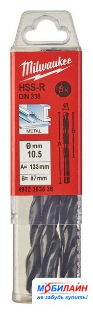 10 шт, обрабатываемый материал: металл, хвостовик цилиндрический, диаметр 4.9 мм, заточка 135°