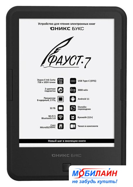 экран 6" E-Ink Carta, 768 x 1024, сенсорный, с подсветкой, память 8 Гб, Wi-Fi