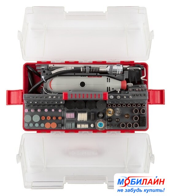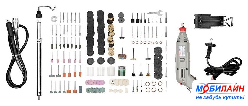 Комплектация | Гибкий вал 105см - 1шт.Подставка для штатива - 1шт. Штатив - 1шт.Абразивные шлифовальные цилиндры - 14шт.Войлочный полировальный круг - 1шт.Фетровые полировальные круги - 6шт. Державка для фетрового круга - 1шт. Резиновый полировальный круг - 2шт. Сверла по металлу - 8шт.Державки для шлифовальных цилиндров - 4шт. Шарошки алмазные - 8шт.Шарошки металлические - 3шт.Круг отрезной алмазный - 1шт. Круг резиновый шлифовальный с хвостовиком - 8шт. Абразивные шлифовальные круги по металлу с хвостовиком - 12шт.Абразивные шлифовальные круги по металлу - 6шт.Абразивные шлифовальные круги по камню с хвостовиком - 6шт.Абразивные шлифовальные круги по камню - 6шт.Щетки-крацовки - 9шт. Круги шлифовальные - 45шт.Усиленные отрезные абразивные круги - 30шт.Отрезные абразивные круги - 46шт.Цанги хромированные - 4шт. Оправы - 9шт.Отрезные армированные круги - 5шт.Круг лепестковый торцевой - 1шт. Ключ комбинированный монтажный - 1шт. Брусок абразивный правочный - 1 шт. Паста полировальная - 1шт. |