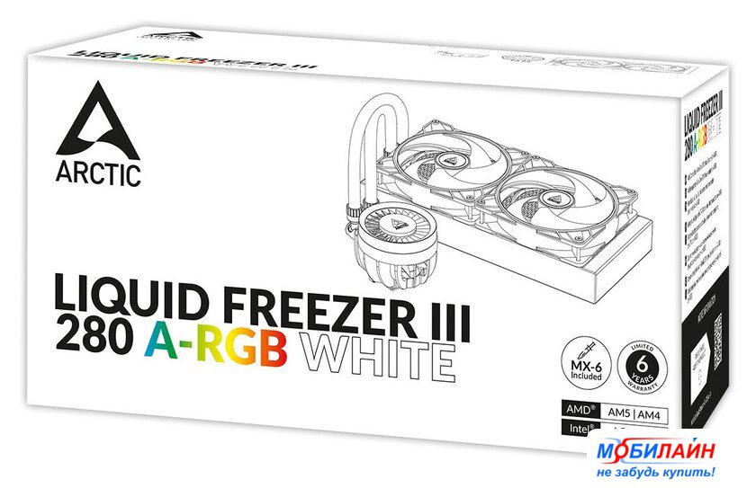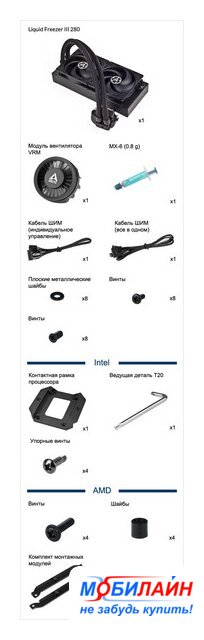 | Комплектация | 1x Liquid Freezer III 280 A-RGB1x Модуль вентилятора VRM1x MX-6 (0.8 g)1x Кабель ШИМ (индивидуальное управление) 1x Кабель ШИМ (все в одном) 8x Плоские металлические шайбы16x ВинтыIntel1x Контактная рамка процессора 1x Ведущая деталь T204x Упорные винтыAMD4x Винты4x Шайбы1x Комплект монтажных модулей |