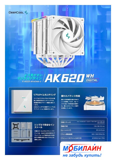 рассеивание до 260 Вт, высота 163 мм, макс. шум 25 дБ, вентилятор 120 мм, 1750 об/мин, PWM, подшипник гидродинамический (FDB), ARGB подсветка