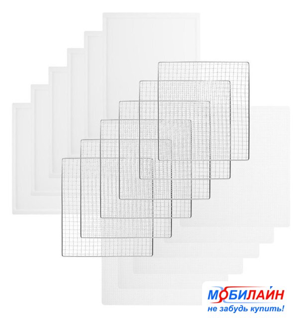 Комплектация | - 6 поддонов для сушки;- 6 поддонов для жидкости;- 6 сеток для трав, ягод и т.д;- 1 корзина. |