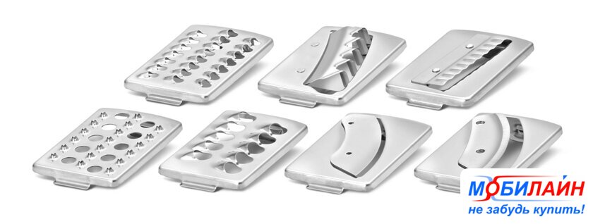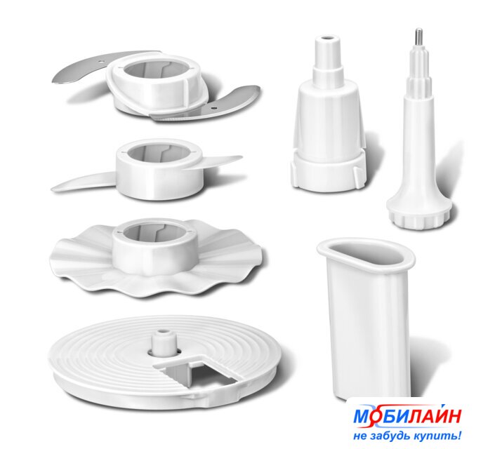 Полная комплектация | Шинковка крупная Шинковка мелкая Терка крупная Терка мелкая Терка для драников Терка для картофеля фри Терка для фигурной нарезки овощей и фруктов Насадка для смешивания Нож измельчитель Насадка эмульгатор |