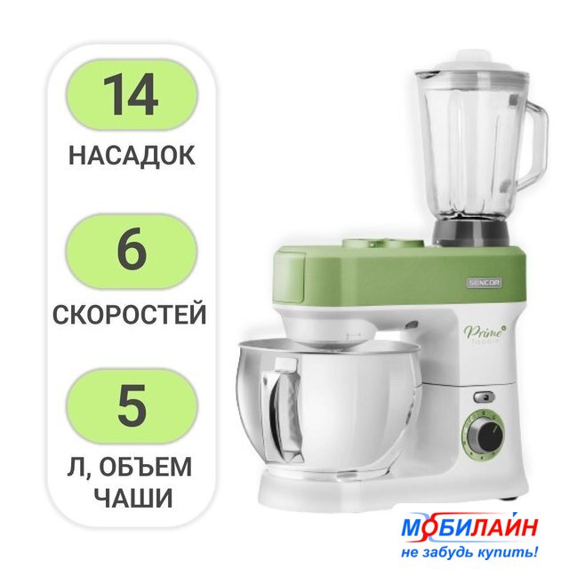 1200 Вт, планетарное смешивание, объем чаши: 6 л, мясорубка