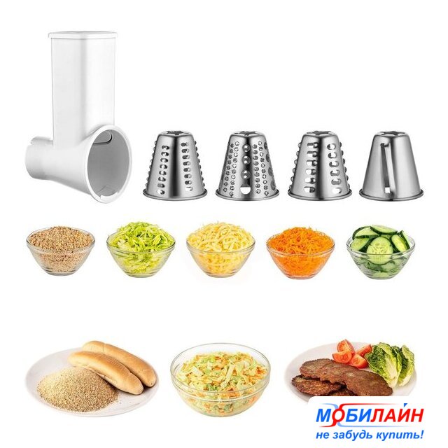 | Функции | мясорубка, блендер, взбивание, смешивание, замешивание дрожжевого теста, терка, шинковка, ломтерезка, драники |