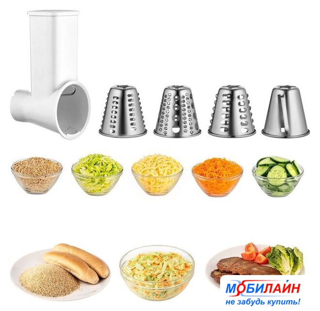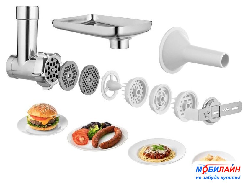 Полная комплектация | Стеклянная чаша блендера 1,5лЧаша миксера 5лДве насадки для смешиванияНасадка для тестаВенчикМясорубка с насадками для регулировки степени измельчения, набивки колбас, изготовления пасты и насадкой-шаблоном для формовки печеньяТолкательОвощерезка с 4 терками (мелкая терка, крупная терка, измельчение, нарезка ломтиками)Миксер для смузи 0,6л с крышкой для использования в качестве дорожной бутылки |