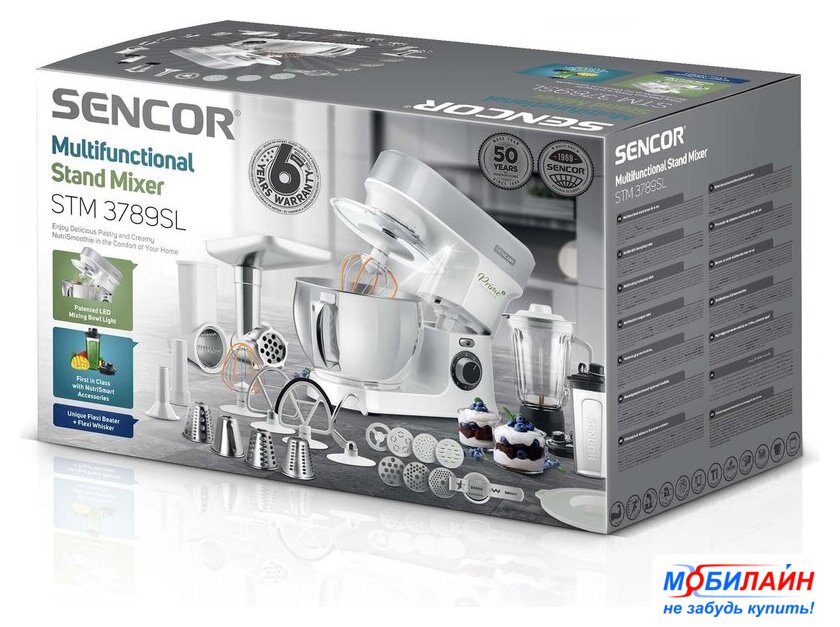 1200 Вт, планетарное смешивание, объем чаши: 6 л, мясорубка