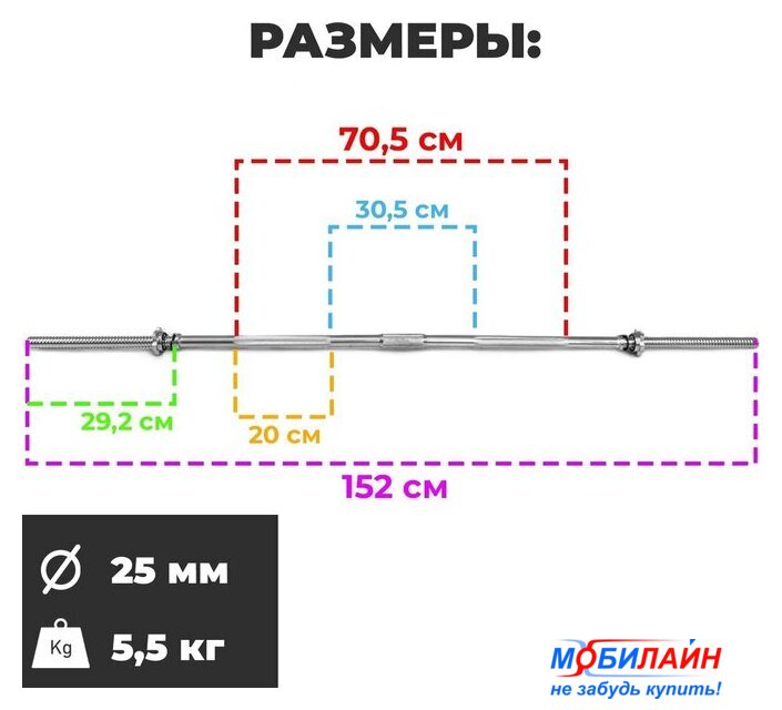гриф для штанги, 1 шт., посадочный 25 мм, длина 150 см