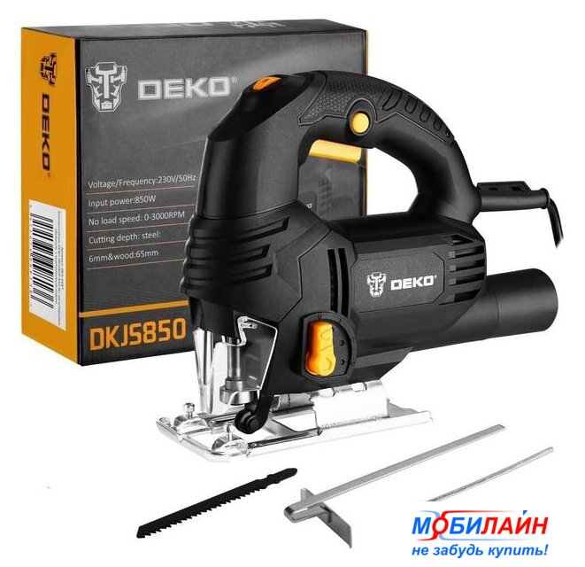 рукоятка-скоба, питание: сеть, 850 Вт, глубина пропила: 100 мм (дерево), 10 мм (сталь), 0–3000 ходов/мин, ход пилки: 20 мм