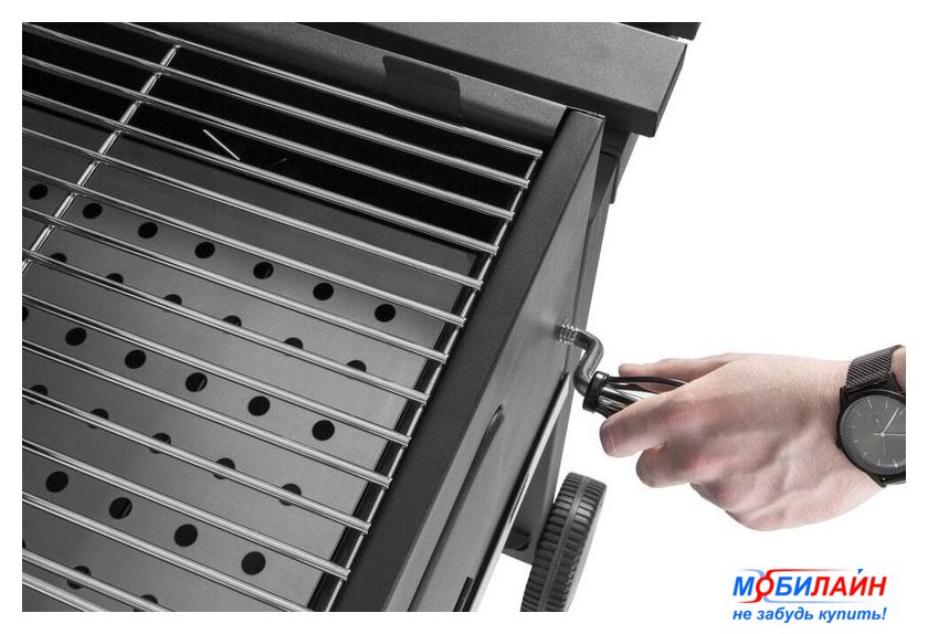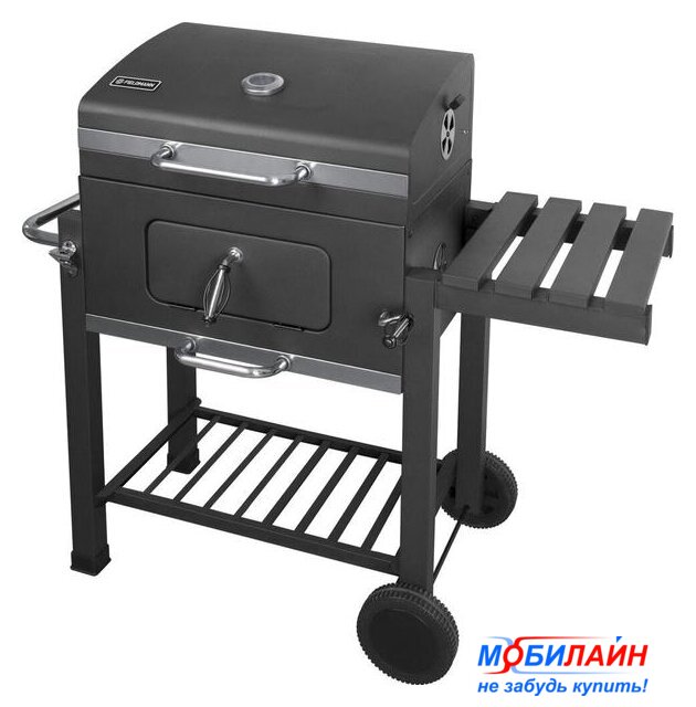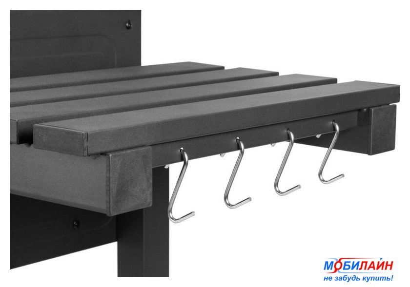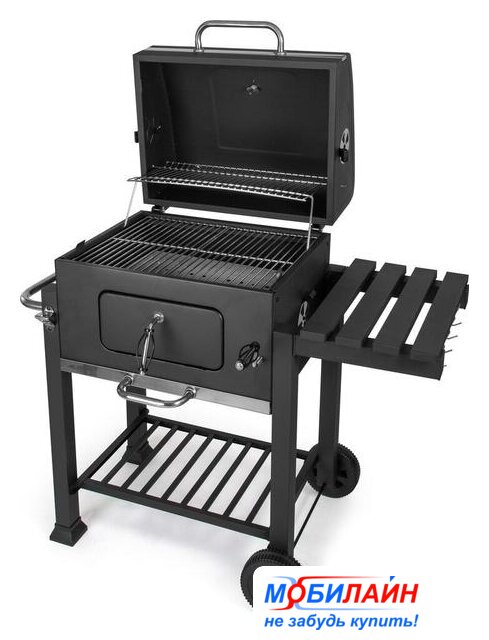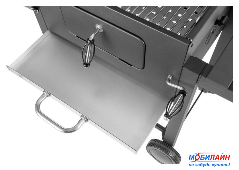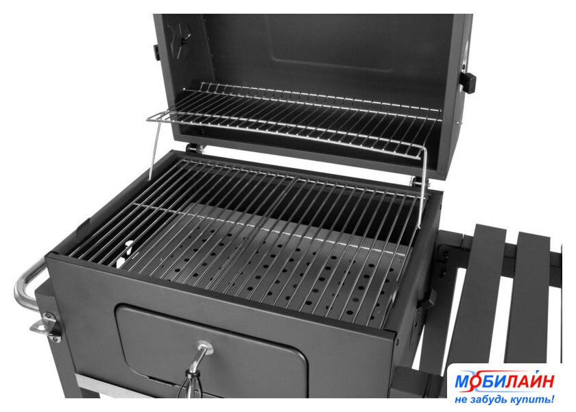 гриль-решетка, сталь (1 мм), крышка, столики, полка для дров (принадлежностей), колеса