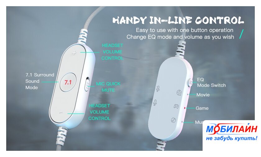 Функции управления | активация объемного звучания, переключение пресетов эквалайзера, приглушение микрофона (mute) |