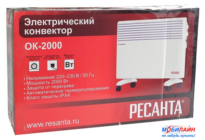 конвектор, 2000 Вт, термостат, возможность крепления на стену, управление механическое