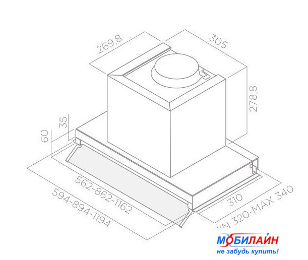 конструкция Т-образная, монтаж настенный, ширина 89.8 см, управление кнопочное, производительность вытяжки 630 м³/ч, производительность мотора 1000 м³/ч, цвет черный