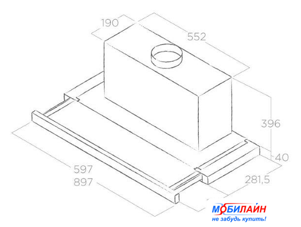 конструкция Т-образная, монтаж настенный, ширина 89.8 см, управление кнопочное, производительность вытяжки 630 м³/ч, производительность мотора 1000 м³/ч, цвет черный