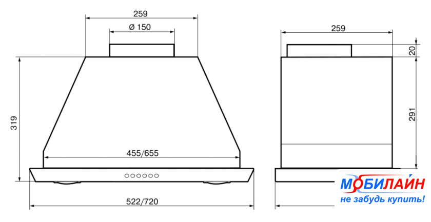 конструкция телескопическая, монтаж для встраивания, управление механическое/кнопочное, производительность мотора 650 м³/ч, ширина 59.8 см