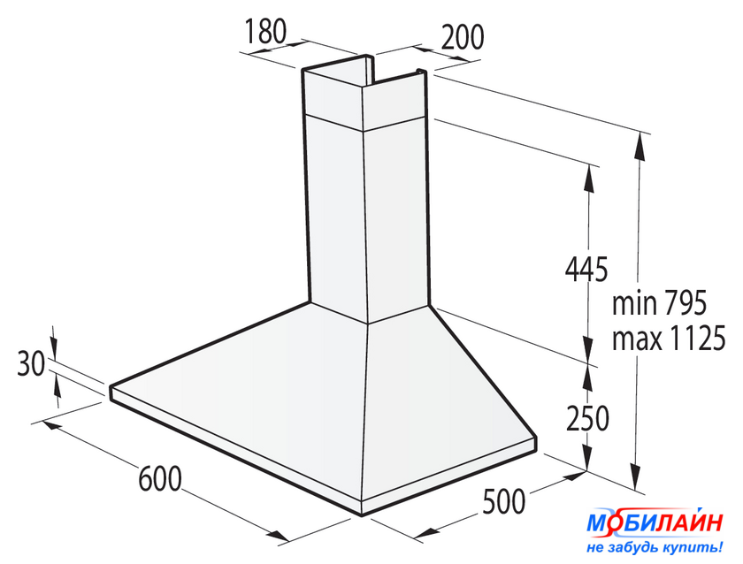 конструкция Т-образная, монтаж настенный, управление электронное/кнопочное, производительность мотора 700 м³/ч, ширина 60 см