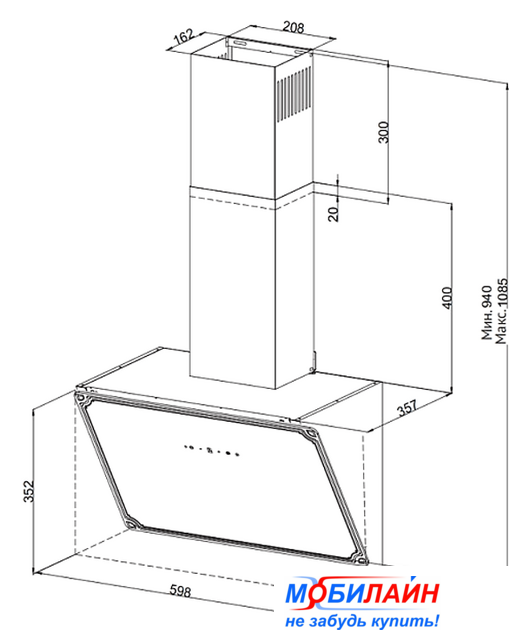 конструкция наклонная, монтаж настенный, ширина 60 см, управление кнопочное, производительность вытяжки 550 м³/ч, цвет черный/серый