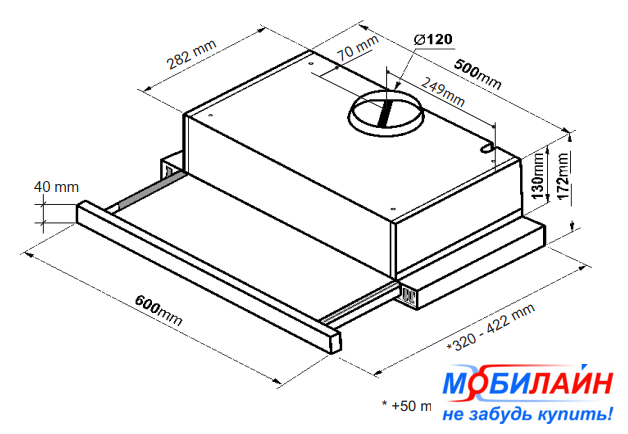 конструкция телескопическая, монтаж для встраивания, ширина 59.8 см, управление механическое/кнопочное, производительность вытяжки 336 м³/ч, производительность мотора 650 м³/ч, цвет серый/черный
